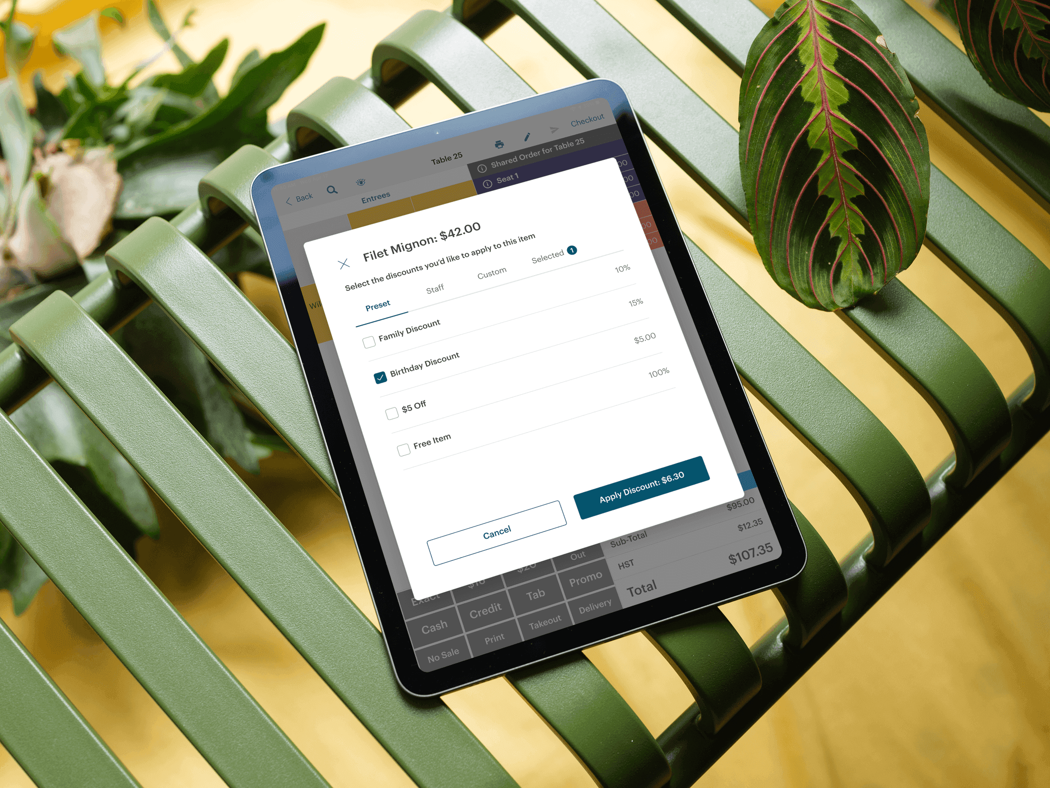 The discount modal appears differently when applying discounts on the ordering screen compared to the checkout screen. The way you select discounts and confirm your changes also differs between the experiences, creating inconsistency.